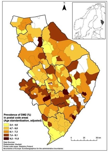 Prevalence of type 2 diabetes by postal code area in eastern Finland in 2012.